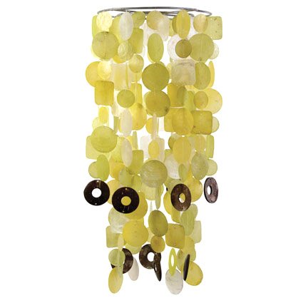 Hanging Capiz Chime is made with a bright and lively mix of citrus tones capiz shells, accented by carved circles of coconut shells. It will tinkle, shimmer, and click clock in the wind and sun. Hang a cordset inside to create a stunning hanging lamp. Great outdoors for your summer gatherings and parties. (should not be left out in rain)